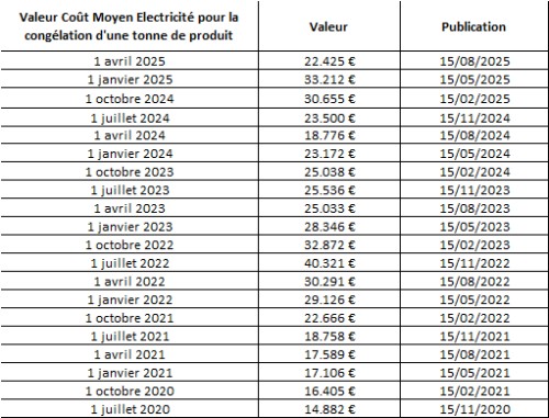 L’indicateur CMECT permet d’apprécier le coût moyen annuel d’électricité pour la congélation d’une tonne de marchandises. On obtient le coût moyen annuel d’électricité pour la congélation d’une tonne (CMECT) en multipliant le coût moyen de l’électricité (€/kWh) par 150 (kWh/t), soit par exemple, en Sept. 2007, un coût de 7.687 €/tonne. A chaque évolution des coûts de l’électricité, ce coût moyen à la tonne évolue comme l’Indice des Coûts d’Electricité (ICE)). Nous sommes alors en mesure de publier, en même temps que les indices, la valeur du coût moyen de l’électricité pour la congélation d’une tonne (CMECT).